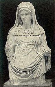 Statue of the chief Vestal Virgin, wearing a white palla and a white veil.
