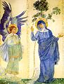 This doctrine of the Virgin Birth is often represented Christian art in terms of the annunciation to Mary by the Archangel Gabriel that she would conceive a child to be born the Son of God, and in Nativity scenes that include the figure of Salome. The Annunciation is one of the most frequently depicted scenes in Western art.[104] Annunciation scenes also amount to the most frequent appearances of Gabriel in medieval art.[105] The depiction of Joseph turning away in some Nativity scenes is a discreet reference to the fatherhood of the Holy Spirit, and the doctrine of Virgin Birth.[106]
