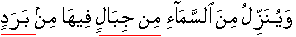 The information about the place from where the act causing decent of hail intermittently, i.e. Sky refers to vast area of atmosphere having many visible sub localities and bodies therein. The area from where the decent is caused is now restricted to "from some mountains in the Sky". is a broken plural feminine genitive noun, grammatically treated as singular. Its qualitative description is , "within it are various hail". The statements in the Grand Qur'aan are an established and proven fact. Its words do not convey thoughts, ideas or information which might suffer vagueness or portray physical realities that might contradict or could wrongly be perceived by the reader in comparison to ground realities becoming visible in time and space. It is not said that within it is . The preposition is placed before it, denoting that a collective noun has variety.