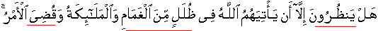 • Are they waiting [to believe/believers to follow Islam wholeheartedly] for no reason except that Allah the Exalted and retinue of Angles may come to them [instead of succinct verbal passages] within area of parasol resulting from Stratocumulus Clouds;