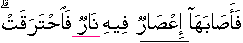 Before we find out as to who is "he", let us see "his" descriptive quality: . This is a complete inverted nominal sentence. The subject of nominal sentence is , fire, and , a prepositional phrase, relates to its elided predicate. The preposition is quite indicative of the elided predicate suggesting that subject/fire is present/exist within it. Fire is present within . Its Root is "ع ص ر". The basic perception infolded is that of pressing, or squeeze grapes or other fluffy things to force out its juice, or what was in it. The fluffy characteristic is because of presence of something loose/fluid/plasma like within some object which, on extraction or flowing out, will render it squeezed or disintegrated in dust like particles. denotes a fluffy twisting sphere object. The fire contained within it has given it the fluffy characteristic.
