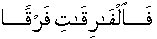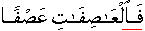 Conjunction particleفَ  Cause and effect indicative + Active Participle: Indefinite; sound Plural; feminine; genitive. This Active Participle signifies those feminine who centrifuge-segregate. Verbal Noun is accusative cognate adverb [مفعول مطلق] which signifies the manner in which the action takes place.  It denotes segregating and distancing one thing from another, one departing away from the other.