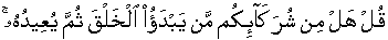 You confront them, "Is there a one from your associates who originates the creation and afterwards recreated it?" [it is sensitive for them, they will keep mum therefore] You, the Messenger [Sal'lallaa'hoalaih'wa'salam] pronounce, "Allah originates the creation and afterwards recreates/revives-takes it to logical conclusion. Then how you people are deluded away from Him?". [10:34]