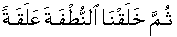 afterwards, We created [you living people] from single sperm; afterwards from the joined and implanted/clung clot [zygote-Greek "zogotus" meaning "joined"]; afterwards from chewed gum like morsel of flesh