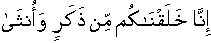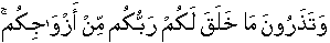 and the One Who created the pairs, all of them. [Refer 42:12] o And in the creation of you people and in the fact that animals are scattered are visible/tangible/ demonstrative/recognition signs for the people to have conviction. [45:04] O you the living people! Indeed We have created you people from a male and a female. [Refer 4913] o Were We then weary with the originating creation? No, [there was even not the slightest weariness as earlier told you 46:33] the fact of the matter is that they are in a state of veiling about the afresh creation/resurrection. [50:15]