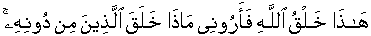 This is the creation of Allah. Therefore/for reason [if they are real existing personalities] show me that which those [whom you call various iela'aha] have created apart from Allah?. [31:11]