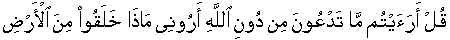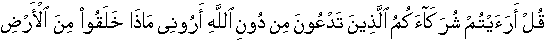 You, the Messenger [Sal'lallaa'hoalaih'wa'salam] ask them, "Have you given a thought about your associates whom you people call apart from Allah [that they have created nothing], show/point out to me what they have created in Earth"