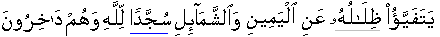 Have they not yet seen [given a thought] towards that which Allah has created from matter/a thing? o Its shadows incline from the right and the left in the state of prostration [as looks a human being in prostration state] for Allah and they are submissive. [16:48] Be aware that whoever exists in the Skies and whoever exists in the Earth, amongst the species of animal kingdom, they all keep prostrating exclusively for Allah. Moreover, the Angels keep prostrating for Allah. Be cognizant, they, the Angels never feel pride of grandeur. [16:49] Have you not yet observed that Allah is the one for Whom prostrates [willingly or perforce/consciously or unconsciously] whoever exists is in the Skies and whoever exists on/in the Earth;