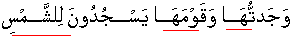 " I found her and her nation that they prostrate for the Sun, instead of Allah; and Shaitan has made their deeds/acts alluring for them thereby he stopped them from the Path and resultantly they are not guided [27:24] since they do not prostrate for Allah". Allah is the One Who brings to light/prominence that which is hidden in the Skies and the Earth; and He fully knows that which you people hide and that which you people reveal/say openly. [27:25]