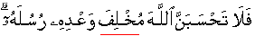 Therefore you should certainly not presume that Allah betrays His promise with His Messengers. [14:47]