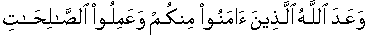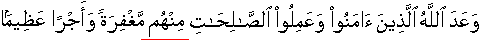 5:09;48:29] It is the promise of Allah, as self imposed obligation with those from amongst you people who accepted/believed and performed deeds/acts righteously/moderately [as directed in the Book of Allah prevalent in time and space] [24:55] and so that she may know that the promise of Allah is like a proven/executed fact. [28:13] This is the promise of Allah. Allah never fails to fulfill His promise. [30:06]