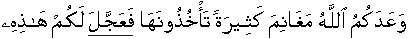 Allah had promised with you for abundant spoils of war which you will acquire, thereupon He has hastened it for you people; [Refer 48:20] It is the promise of Allah, as self imposed obligation with those from amongst them who accepted/believed and performed deeds/acts righteously/moderately [as directed in the Book] for them is the forgiveness and splendid reward. [48:29]