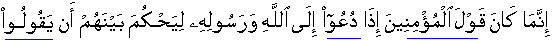 Indeed the statement of the true believers, when they are called towards Allah and His Messenger so that he may adjudge between them, is only this that they say,