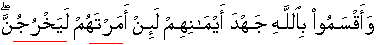 And they swore by Allah, their swearing being emphatic, that indeed if you had ordered them certainly they would go forth/move out [for participating in war].