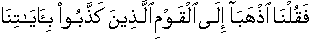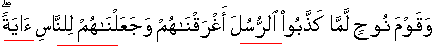 [when both two had met] Thereupon We said "You both two go towards the nation [of Fir'aoun]" That nation who publicly contradicted Our demonstrative unprecedented signs whereby We destroyed them, destruction by forceful entrance [inside water by collapsed skeleton bridge]. [25:36] And the nation of Noah [alai'his'slaam], when they publicly contradicted the Messengers We drowned them, and We made them for people an example [Note: their mention is found in the literature of almost all existing nations/civilizations] o And for evil mongers/unjust/distorters of facts We have prepared/kept ready a painful torment. [25:37]