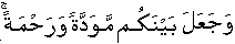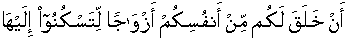And from His demonstrative signs is that He created from your selves your wives so that you people could have respectively upon her the ultimate placidity/tranquility/serenity; and He has placed amongst you [husband and wife] feelings of love and compassion.