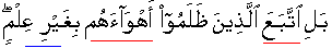 Nay, [their wandering is not for reason of any ambiguity] the fact of the matter is that those who wronged and did injustice actually followed their selfish lusts and conjectural myths on the ground other than/without the knowledge [Guidance/the Book from Allah].
