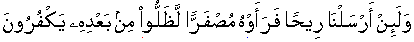 And if We had sent a wind whereupon they watched it/their crops turning yellow they would have certainly after it shadowed expressing ingratitude. [30:51] [Without فَ ditto 27:80]
