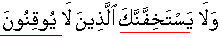 40:55;40:77] Therefore, remain coolly perseverant, indeed the promise of Allah [regarding Last Day] is a fact, and let not those who have no conviction [of that day. hereafter and accountability] seek you hastening it/and let not those, who have no conviction of the hereafter and accountability, impair your cool/quiet/frustrate you by repeated annoyances. [30:60]