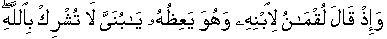 And when Looq'maan said to his son while he was affectionately advising him [wisdom pearls], "O my son! You should never associate partners and equals with Allah; o it is absolutely certain that the act/idea of associating partners and equals with Allah is undoubtedly the greatest distortion" [the first introduced by Elite class of nation of Noah]. [31:13]