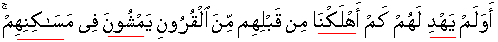 20:128] Is it [their transgression and not believing Aa'ya'at] that it has not guided them that many civilizations before them We have annihilated, in the residential places of whom they walk around? [Same pronouncement in in same words in