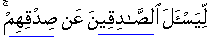 so that He may question The Truthful/these Chosen/Elevated/Selected Persons about [response received by them to] their truth. [Same
