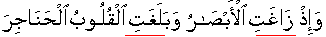 and when focus of eyes failed to perceive [sudden happening of unexpected attack] and the hearts felt reaching the throats o and you [a group-3:154] were engaging in assumptive talk contrary to fact presumptions about Allah [the presumption/conjectures of the days of emotionalism-3:154] [33:10]