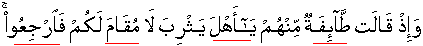 and recall [on way] when a group from them/Muna'fi'qeen said to others, "O you the inhabitants of Yassrib/Madina, there is no standoff for you people, therefore, you people return back"
