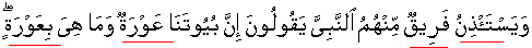 and recall [before leaving] a group of them/Muna'fi'qeen were asking permission of Elevated, Distinct and Chosen Revivalist [Muhammad Sal'lallaa'hoalaih'wa'salam] saying, "Our houses are bare and exposed" while factually those were not exposed. o They intended nothing but an escape [from war]. [33:13] [this is peculiar trait of Muna'fi'qeen that they do not like and believe, and escape war for the cause of Allah]