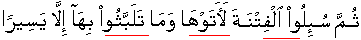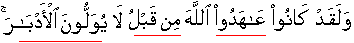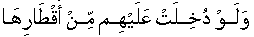 [the falsity of their excuse of exposed houses may be seen] And had people entered upon them from all its sides o thereafter they were asked for creating the liquefying disturbance they would have certainly done it and they would not have delayed it except slightly. [33:14] [Read with 8:15] And certainly they were bound to Allah [command in 8:15] before this that they will not turn their backs [when they are to meet in hostility with non believers] [Same