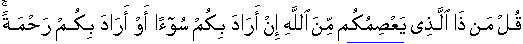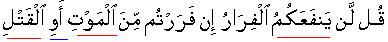You, the Messenger [Sal'lallaa'hoalaih'wa'salam] pronounce, "Never will benefit you people the running away if you ran away for consideration of the natural death or killing [in war]/murder o and [if you ran away from war] that point in time you will not enjoy except for a little while". [33:16] [Read with 35:02;39:38] You, the Messenger [Sal'lallaa'hoalaih'wa'salam] pronounce, "Who is he who can hold you people back from Allah if He decided to harm or He decided showering mercy upon you". [Same pronouncement in same words in