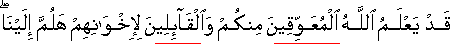 Allah has certainly exposed/knows those from you who prohibitively hinder and who say to their brothers, "Come to us" o and except few they do not come to participate in war. [33:18]