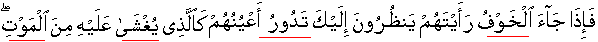 Thereat when the fear [of war] is eminent you the Messenger [Sal'lallaa'hoalaih'wa'salam] notice that they are looking at you with their eyes revolving like the one upon whom has lurked the death.