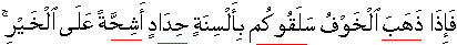 Thereafter when the fear has departed they rush to you people with hardened/offensive tongues, yearning to have the best gain/advantage [from the unsolicited gains of war].