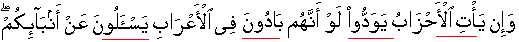 And if the Confederates/Allied Forces enter they would wish that they were suburbanites amongst the Foreign Settlers in Arabia asking/enquiring about your news [result of war]. o And if they were amongst you people they would not have participated in war except few. [33:20]