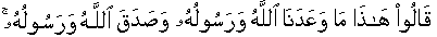 they said, "this is that which Allah and His Messenger had told/promised to us and Allah and His Messenger has truthfully exhibited it". o And it increased them but in belief and respectful salutation and submission. [33:22]