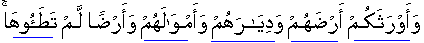 and He caused you to inherit their land, and their abodes, and their goods and lands which were not yet brought under cultivation. [Same pronouncement in same words in