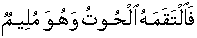 Know the fact that Yunus [alai'his'slaam] was performing the assignment as one of the sent Messengers at the point in time when [on assessing complete unresponsiveness] he ran, after walking away from his nation in the state/grip of heightened feeling of anger/heavy heartedness, towards the already embarked/Laden Ship, ready to sail. [37:139-140]. Thereat/for reason-cause, he made himself weak/dehydrated/haggard [by heightened feeling of anger and running]. Thereupon, he was in the state of slipped ones/loosing hold of feet falling into the sea. [37:141] Thereat, for reason of having slipped and fallen in Sea, the male Whale made effort and swallowed him whole, while he was in sluggish state awaiting and expecting help for rescue. [37:142]