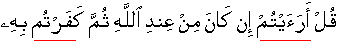 41:52] You the Messenger [Sal'lallaa'hoalaih'wa'salam] pronounce, "Have you people thought/considered/ reflected/seen that if this Qur'aan is from Allah and thereafter you have refused to accept that,