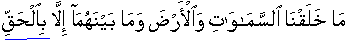 [Same information in same words in 15:85] We have not originated/created the Skies and the Earth and what is in between the two of them except for a determined purpose/as an evident fact. [Read with 6:73;14:19;15:85;16:03; 29:44;30:08;39:05;44:39; 45:22;64:03] and for a determined duration with appointed moment of termination. And those, who have refused to accept, they are the ones who deliberately incline themselves to knowingly and consciously refrain from whatever they were admonished. [46:03] [Similar question in