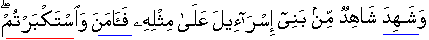 while a witness from amongst Bani Iesraa'eel has testified upon its quote whereupon he has accepted/believed but you people have responded reflexively puffed up with arrogance and pride of grandeur and superiority.