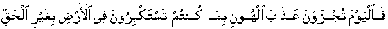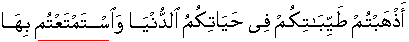 it will be pronounced, "you people exhausted your good things in the life of you people in the lowly world and in that you people consciously absorbed yourselves in enjoyment, in consequence today you people will be requited with humiliating chastisement for the reason that you showed arrogance [against Aa'ya'at of Allah] without any reason and rhyme in the Earth/worldly life, [Similar information in 6:93]