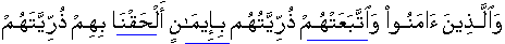 And those who accepted/believed and their progeny who consciously and purposely followed them in good deeds with belief, We joined/family them with their such progeny,