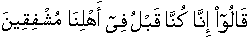 They said, "Indeed we, in aforetimes in the world, used to be apprehensive about our family/household, [52:26]