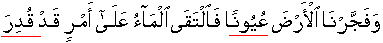 and We caused the Earth to gush forth the springs whereat the water reached to meet the decided quantity for executing the Command that was ordained. [54:12]