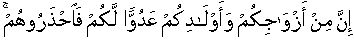 Indeed from amongst your wives and your progeny some are like enemy to you, therefore, you people be mindful of them;