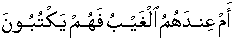 Or with them is the Knowledge of the Unseen [Past and future events not in their sight and witnessed by them] whereby they keep writing it? [68:47]