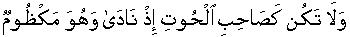 and be not [in haste in response to disbeliever's utterances seeking quick decision] like the Companion of the Fish when he called and he was in a state of distress/agony/respiratory difficulty. [68:48]