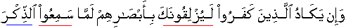 And indeed those who have persistently refused to accept/believe are almost bent upon, as if to remove you the Messenger [Sal'lallaa'hoalaih'wa'salam] from the scene with the sharp focuses of their eyes, when they hear the Admonition/Grand Qur'aan,