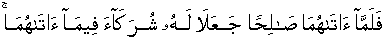 Resultantly when He gave both two of them a perfectly proportioned son they both two ascribe for Him partners in what He gave to both two of them.
